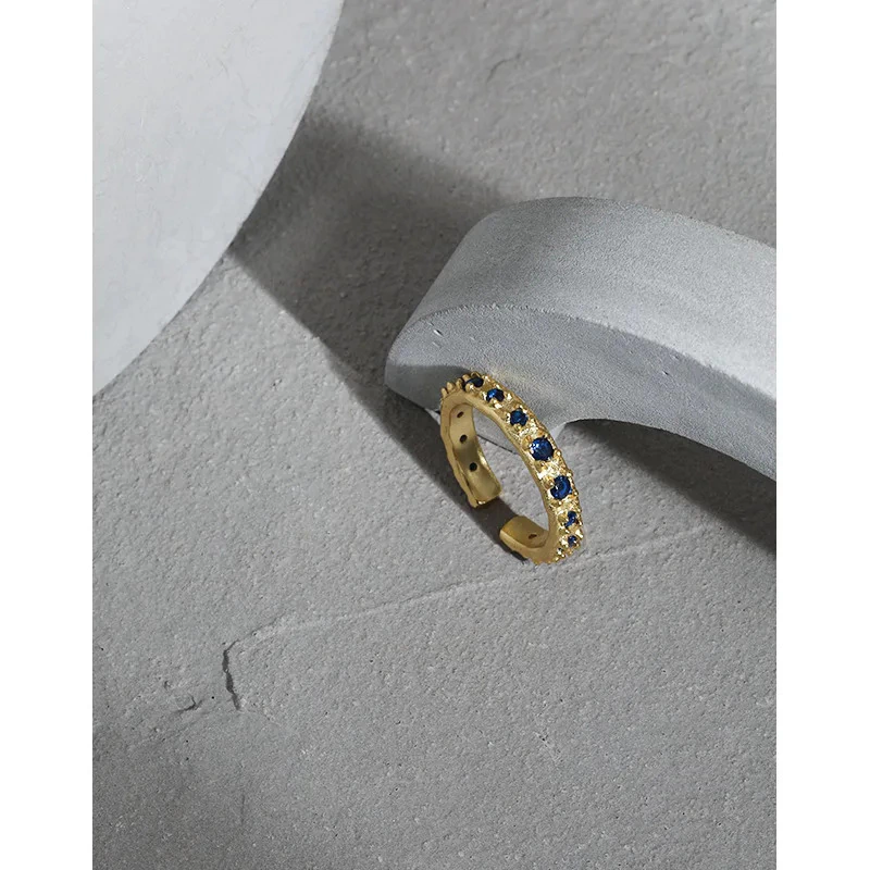 Anel regulável com banho prata ou dourado e detalhes em cravação com zircônias azuis.
