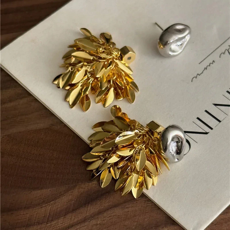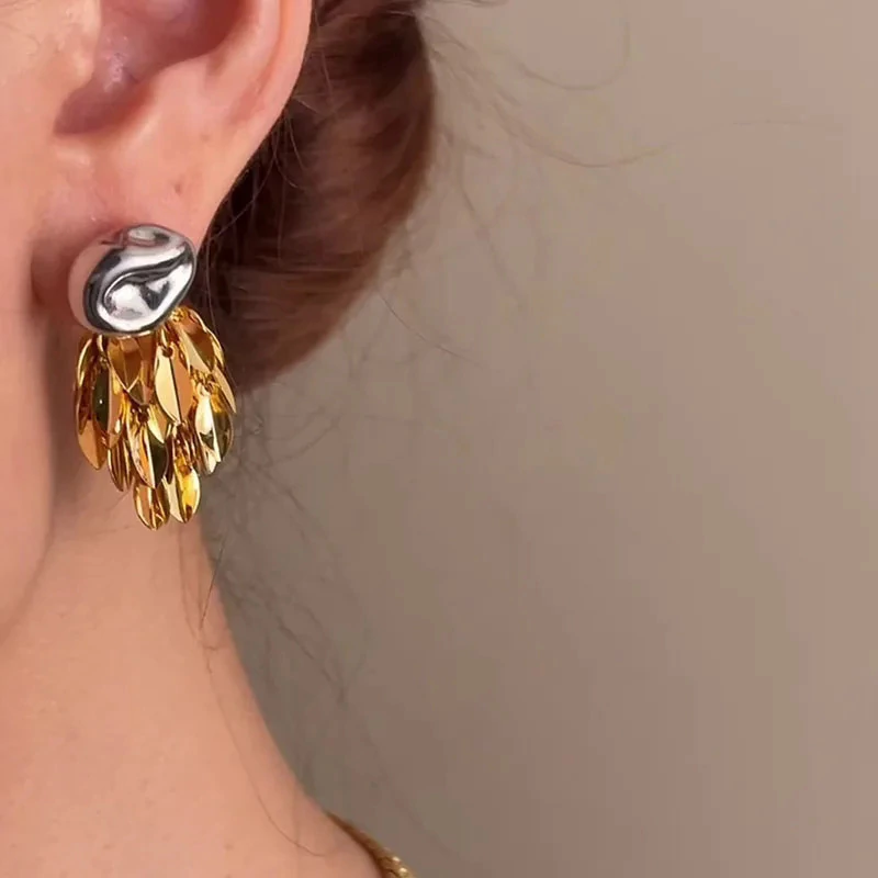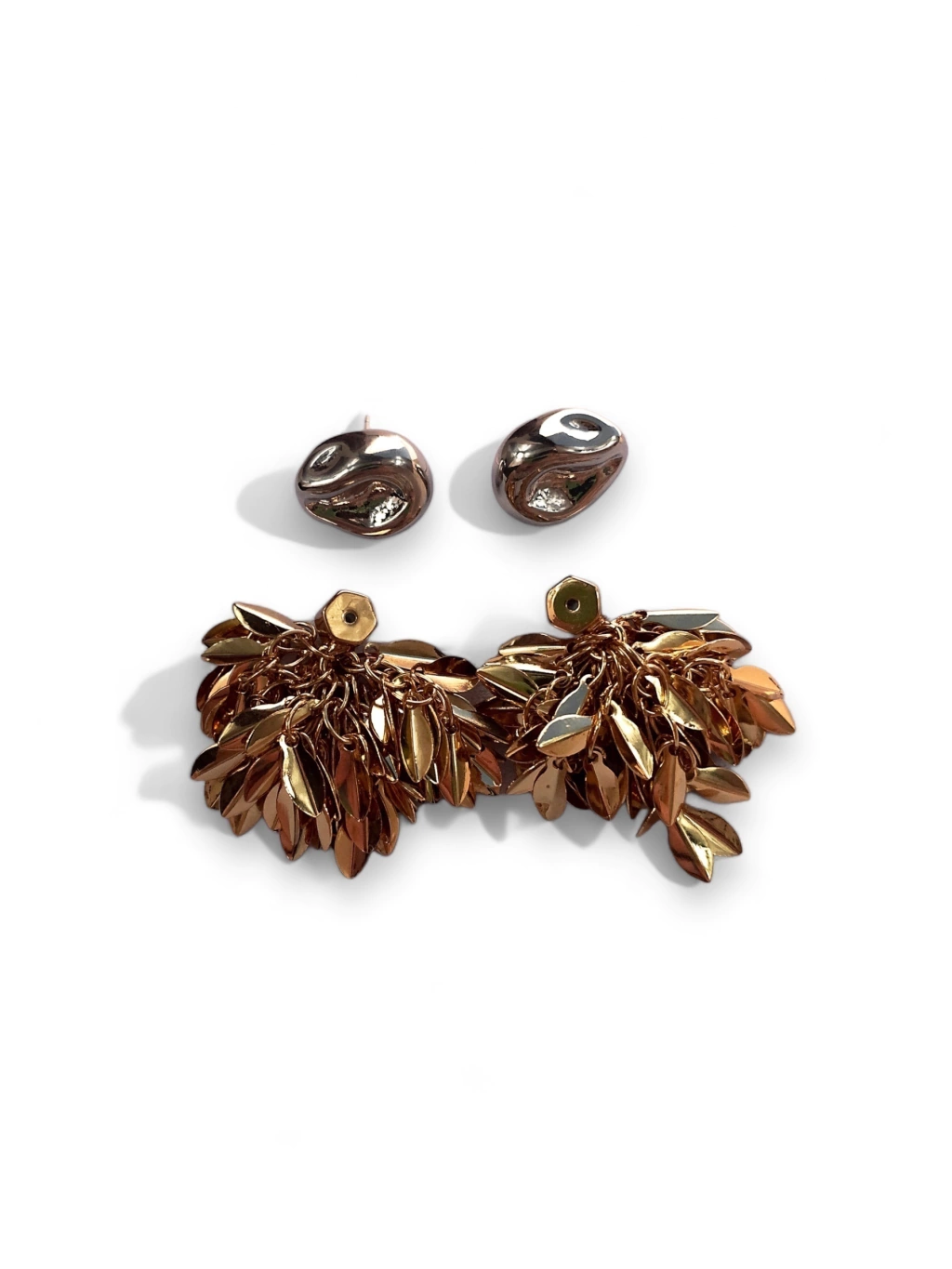 Brinco com banho prata e dourado composto por suporte em formato bean e pendentes que remetem à folhagens. Pode ser usado de duas formas, com ou sem os pendentes.