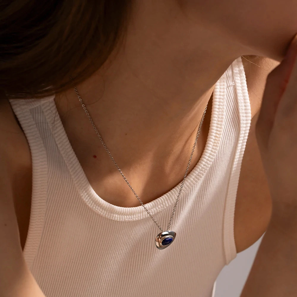 Colar com banho prata ou dourado e acabamento com pedra lápis lazúli.